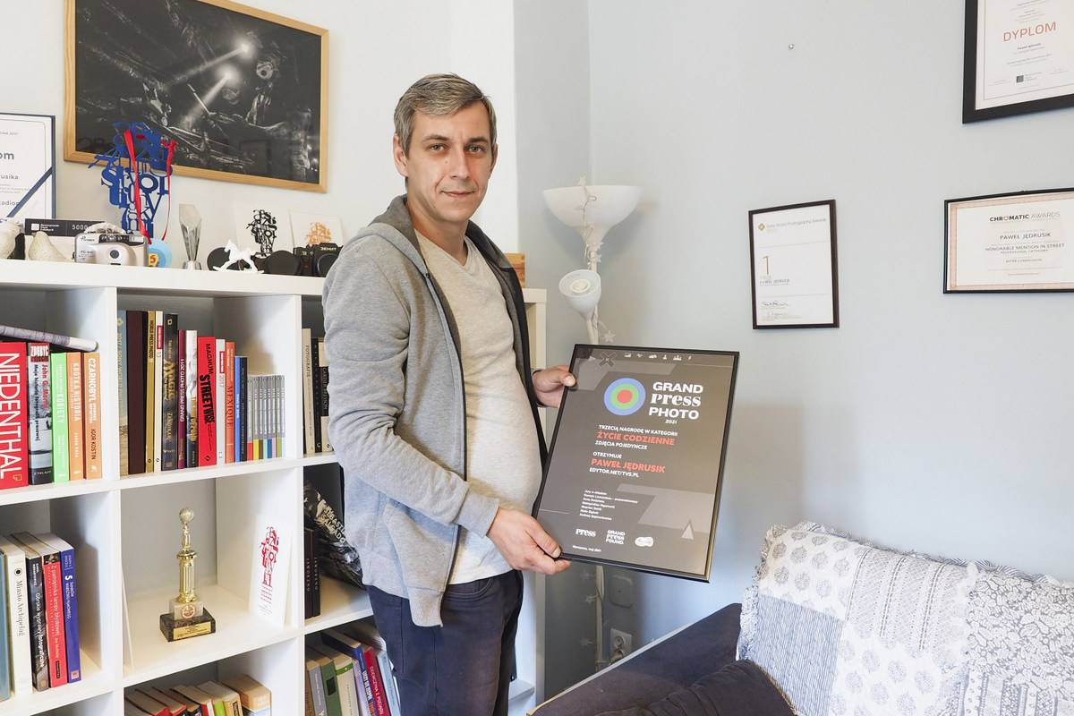 [caption id="attachment_223699" align="aligncenter" width="1200"] Paweł z jedną ze swoich licznych nagród za fotografię prasową[/caption]