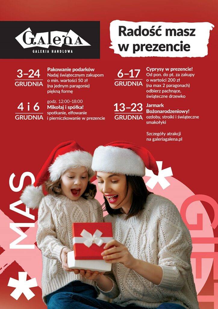 W tych dniach, w Punkcie Obsługi Akcji, za okazaniem paragonu o wartości min. 50 zł hostessy zapakują Klientom galerii świątecznie prezenty. Przy tym stanowisku można zakupić również bony podarunkowe Galerii Galena.