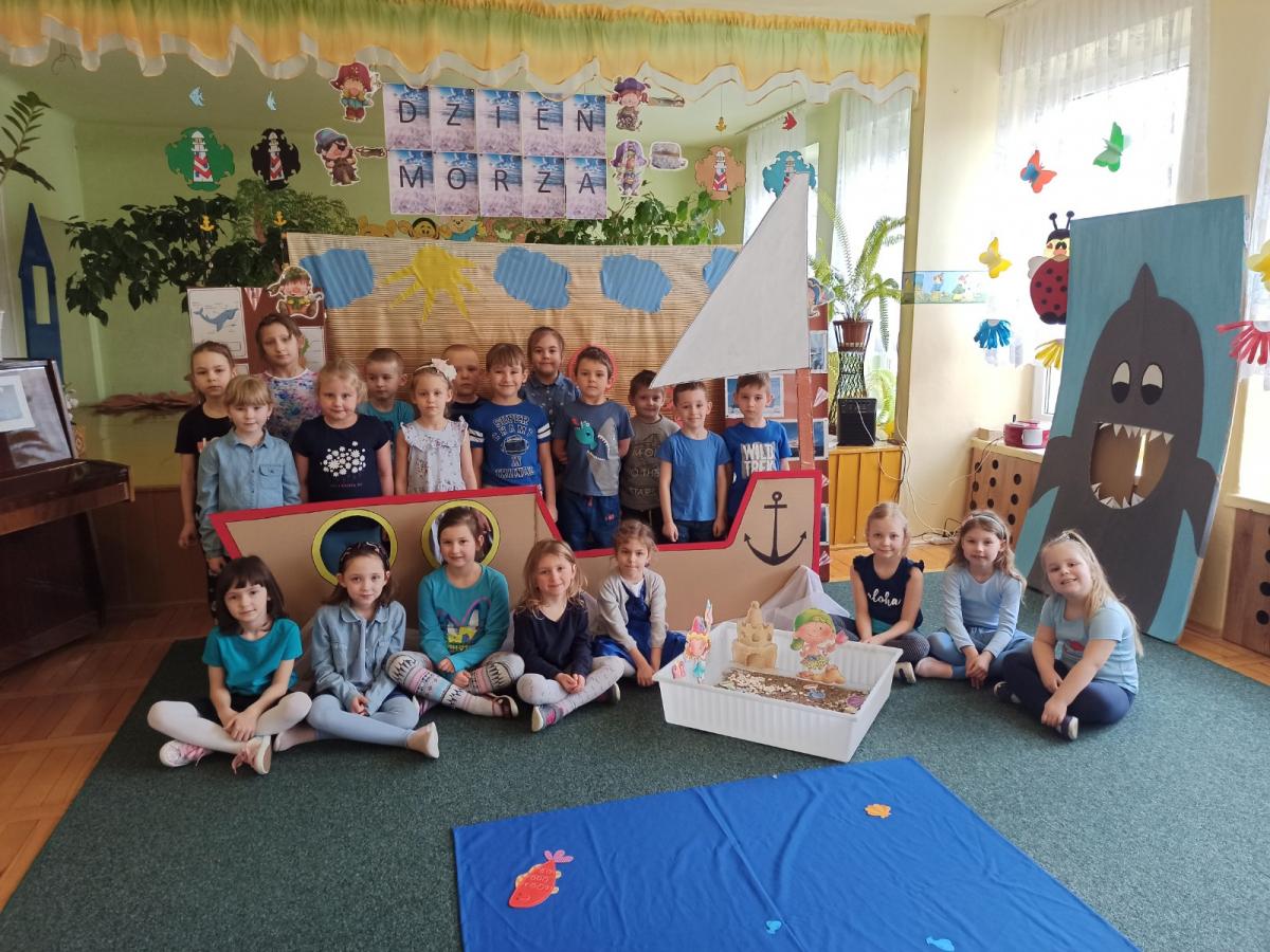 Przedszkolaki świetnie się do tego przygotowały ponieważ wszędzie królował kolor niebieski. Słuchaliśmy piosenek o tematyce morskiej, szum fal i śpiew mew towarzyszył nam podczas całych zajęć. Nie zabrakło sztormu na morzu:). Łowiliśmy ryby, puszczaliśmy papierowe łódki oraz dowiedzieliśmy się, że woda w morzu jest słona!!! Na Naszej Sali zacumował wielki statek, którym sterowali przedszkolni piraci. Jak na prawdziwe morskie opowieści przystało, nie zabrakło również skarbu ukrytego na piaszczystej plaży. Dziękujemy Naszym Kapitankom – Pani Grażynie oraz Pani Natalii, za ten bajkowy rejs po morzu. Ahoj - ahoj!!!