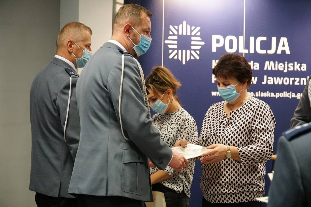 Podziękowania w tak trudnym dla wszystkich pracowników służb mundurowych oraz służby cywilnej, złożył Prezydent Miasta Jaworzna Paweł Silbert. Szczególne podziękowania Prezydent złożył sierż. szt. Piotrowi Nowakowi, który jako wolontariusz zgłosi się w trakcie urlopu do pracy w Domu Pomocy Społecznej w Czernichowie w czasie ubiegłorocznej fali pandemii COVID - 19. Za ten czyn został odznaczony przez Prezydenta RP Andrzeja Dudę - Srebrnym Krzyżem Zasługi.