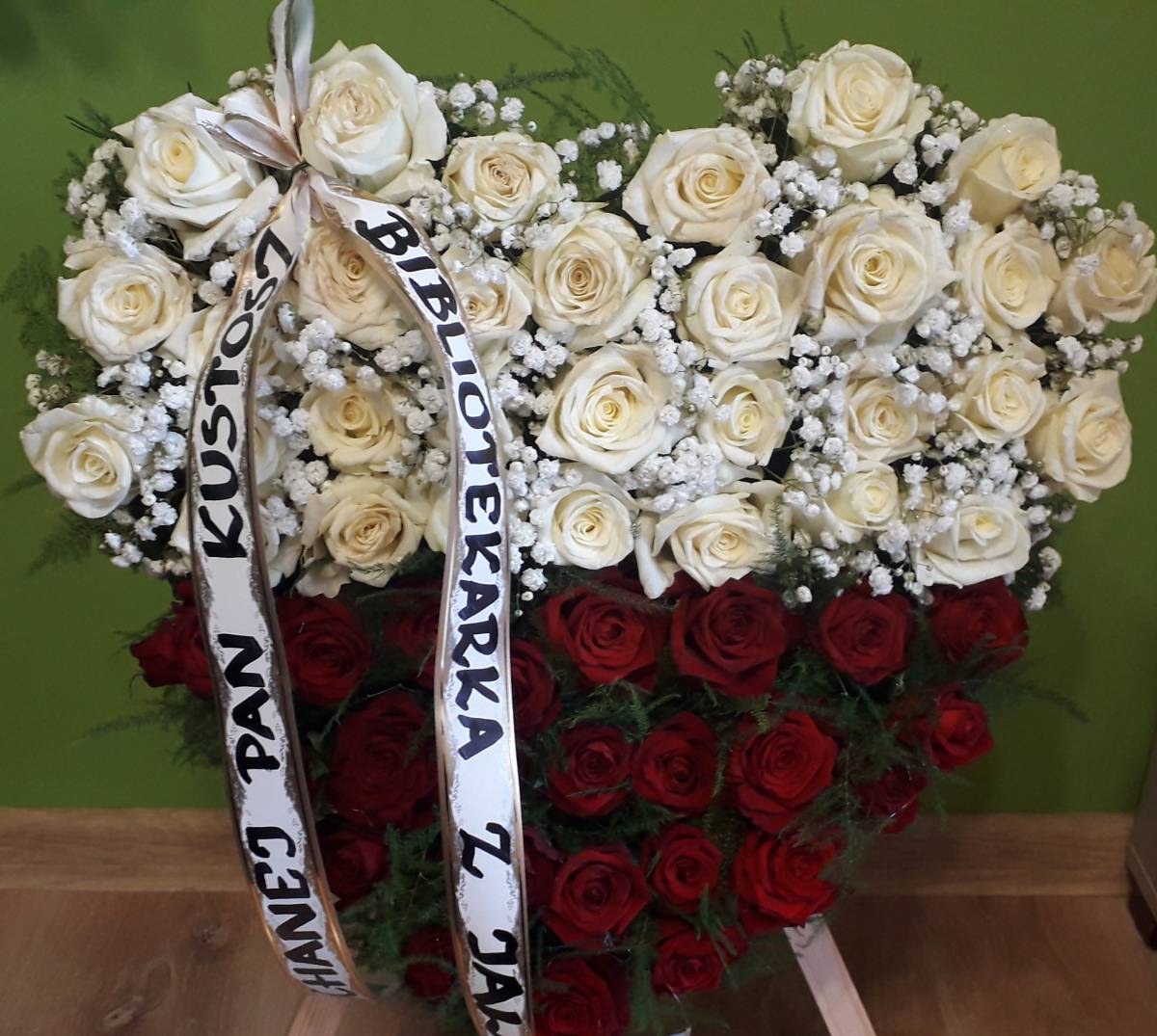 Tyle Pani Marii chciałabym powiedzieć, a tylko milcząco złożyłam me serce na jej grobie. Róże biało-czerwone z szafą: Kochanej Pani Kustosz bibliotekarka z Jaworzna.