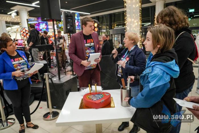 Ta słodka inicjatywa stała się już piękną tradycją, która co roku towarzyszy jaworznickiemu finałowi. Symboliczny, czerwony tort został zaprezentowany na scenie, a następnie pokrojony i rozdany wolontariuszom. Gest Cukierni Puchatek spotkał się z serdecznymi podziękowaniami oraz dużym entuzjazmem uczestników wydarzenia, którzy chętnie ustawiali się w kolejce, by spróbować wyjątkowego wypieku.