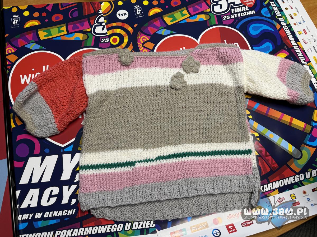 Dodatkowo ośrodek przekazuję również dar, który sam otrzymał, aby przekazać go na WOŚP. To wełniany sweter zrobiony na drutach przez Katarzynę Łazarską, uczennicę klasy 1c II Liceum Ogólnokształcącego w Jaworznie.