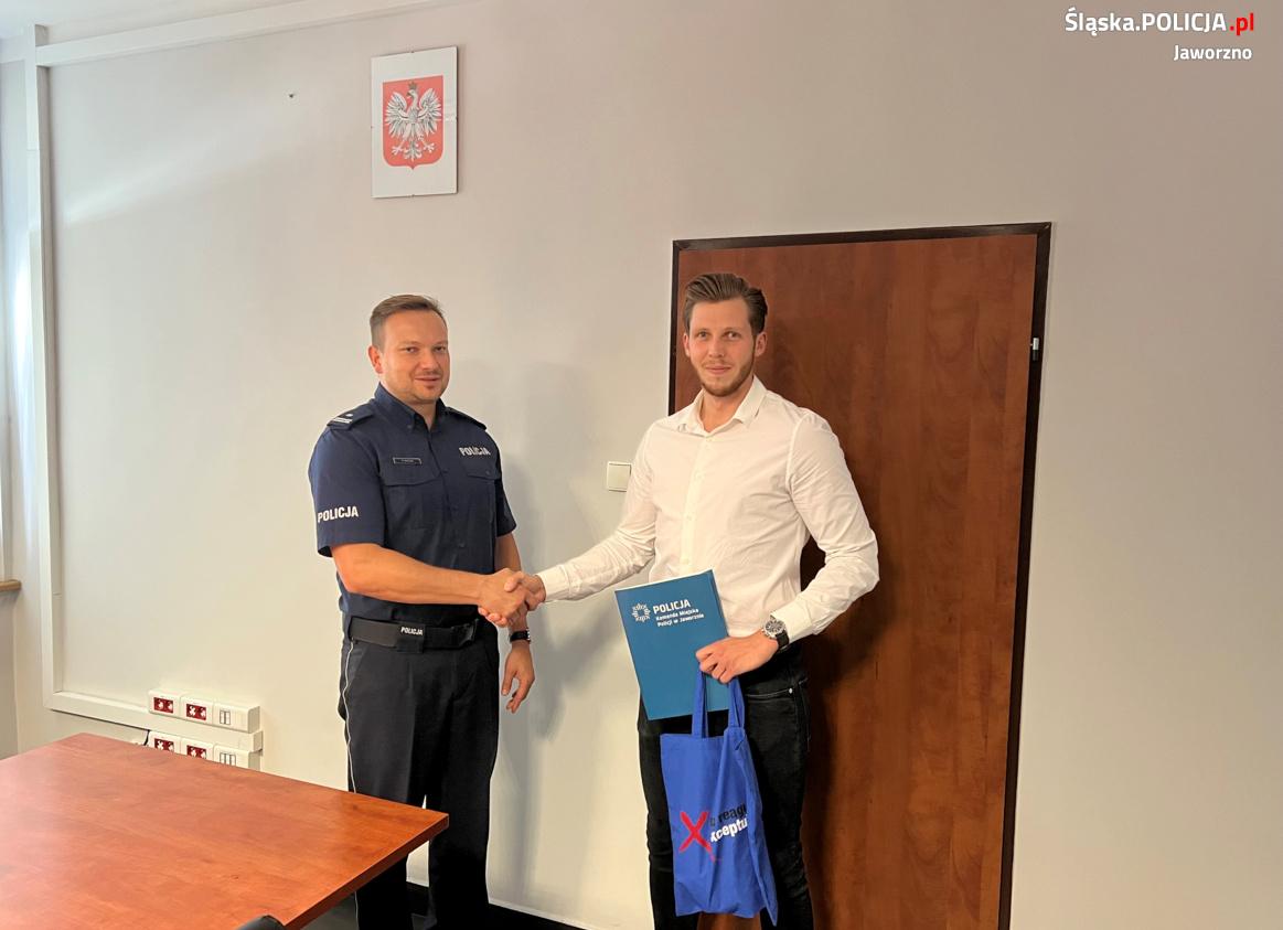 Pan Dawid uratował tonącemu mężczyźnie życie. Jego bohaterska została doceniona przez kierownictwo jaworznickiej komendy policji.