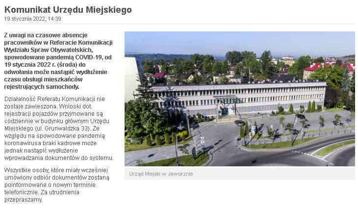Na swojej stronie internetowej Urząd Miejski w Jaworznie ogłosił komunikat, w którym możemy przeczytać, że Referat Komunikacji Wydziału Spraw Obywatelskich dłużej niż zwykle będzie rozpatrywał wnioski o rejestracje pojazdów mieszkańców miasta.