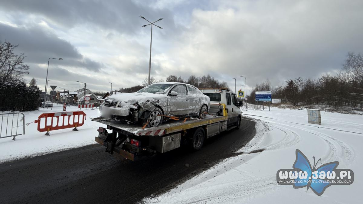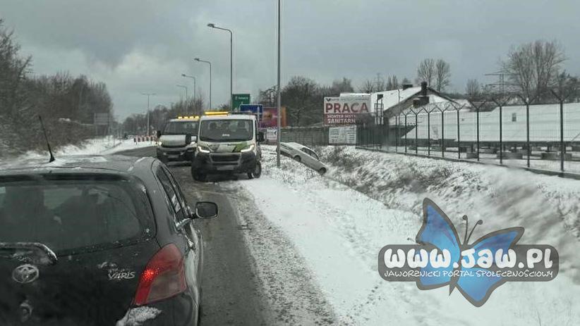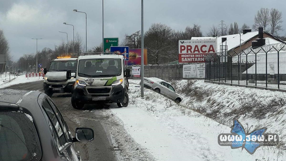 Chwila nieuwagi oraz śliska droga wystarczyły, aby doszło do kolizji na DK 79 w Jaworznie. Jedno auto wpadło do rowu przy ulicy Jana Pawła II.