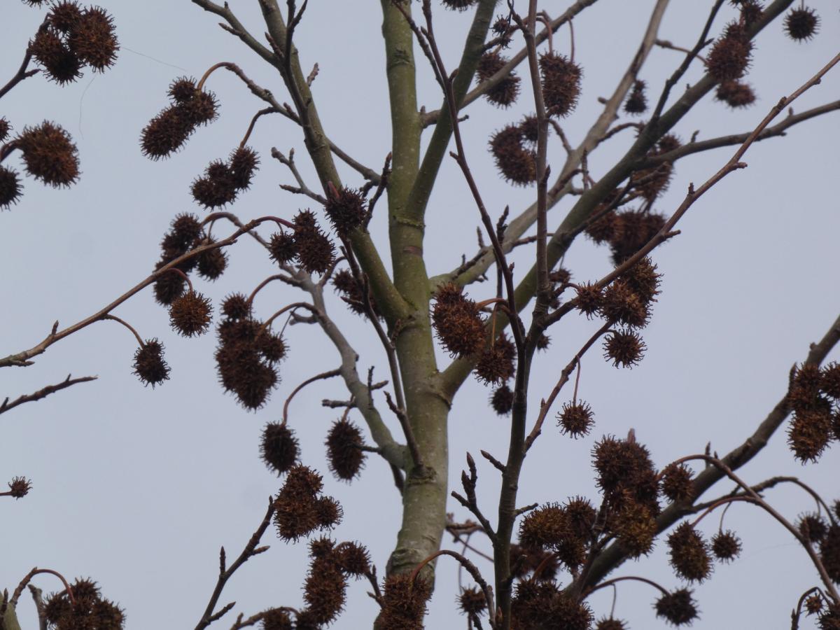 Zacznijmy od ambrowca. Drzewo wygląda okazale. Jest dość dobrze dopasowane do przeznaczonej dla niego doniczki z porowatymi ściankami, bo tak należy postrzegać miejsce po jaworze. Po prostu tam po bokach żyznej gleby raczej brak. I tutaj warto przytoczyć najważniejszą cechę tego gatunku akcentowaną w wielu źródłach. To rozległy system korzeniowy. Tutaj raczej nie będzie mógł rozwinąć tego atutu i to niezależnie od tego, jak wiele żyznej gleby sypnie się pod pień. Zasadniczo przez kilka lat drzewo będzie cieszyło oczy odwiedzających rynek. Liście w dużym uproszczeniu mają zarys zbliżony do klonów. Ich brzegi są mocno ząbkowane. Jesienią przebarwiają się od żółci przez pomarańcz po czerwień i fiolet. Tak to wygląda u chrzanowskiego okazu, bohatera filmu w cyklu Flora_stories, który wprowadzono do parku w 2013 roku. Jaworznicki ambrowiec już ma zawiązane owoce. Wystarczy zerknąć w koronę, aby dostrzec tam liczne kuliste kolczaste kulki owocostanów. Pojedynczy owoc to dwuklapowa torebka zawierająca po dwa nasiona z krótkimi skrzydełkami. Dzięki niemu drzewo stabilnie rośnie nawet tam, gdzie pod powierzchnią ziemi znajdują się trudne warunki, jak choćby jurajska zwietrzelina zalegająca na głębokości około metra.
