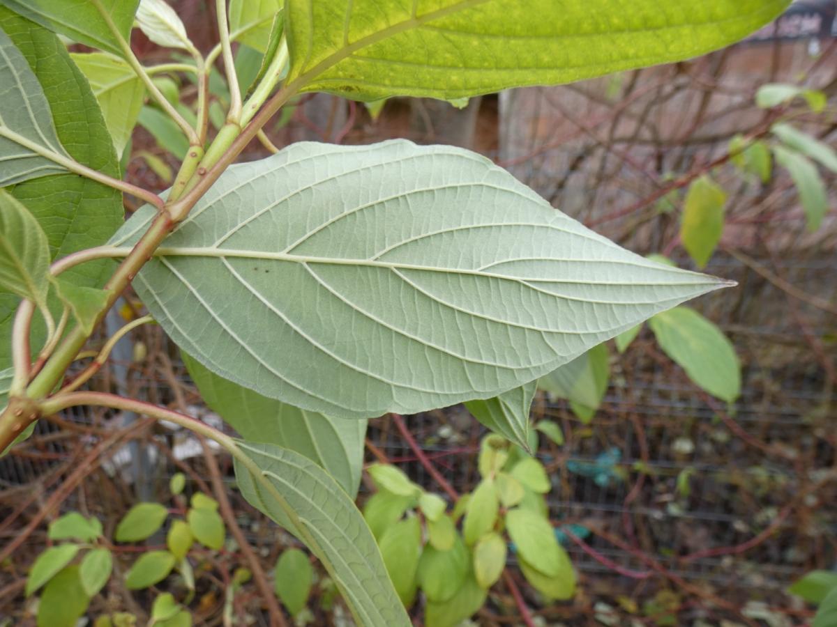 Tego dnia, a było to 8 grudnia, wysiadłem na przystanku Urząd Miejski. W tej okolicy pod opuszczonym domem zauważyłem krzew derenia, który wciąż miał zielone liście. Jego pędy są grube, zielone, miejscami czerwono nabiegłe. Ważną cechą naszego bohatera, któremu zima niestraszna, szczególnie taka, która potrafi dać w pysk i sobie pójść, są wciąż zielone blaszki liściowe. W grę wchodzą dwa gatunki, które do niedawna były łączone w jeden w dwu odmianach. Teraz mamy do czynienia z dereniem białym lub dereniem rozłogowym. Nasz bohater reprezentuje drugi z nich, ponieważ jego blaszki liściowe są wydłużone na szczycie, a ich boczne nerwy wyrastają powyżej połowy długości blaszki. Ojczyzną tego gatunku jest Ameryka Północna. Dla odmiany typowy dereń biały o jaskrawo czerwonych pędach z natury rośnie od Syberii po Daleki Wschód.