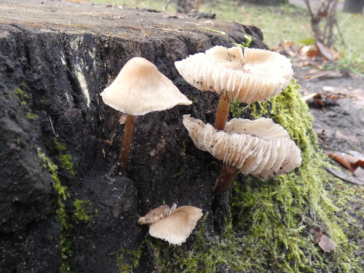 W drodze do ambrowca przeszedłem się przez park Zielona. Tutaj obejrzałem sporo drzew i krzewów, ale teraz skupiłem się na pozostałościach po wyciętym dębie szypułkowym. Wciąż można oglądać pniak po nim oraz sporą kłodę. Może to być zaczątek kolejnej modnej parkowej tendencji. Pozostawiania martwego drewna, aby zwiedzający mogli oglądać jego destrukcję. Tej póki co nic nie rusza. Jedynie na korze rozwijają się płaty delikatnego mchu o cienkich blaszkach liściowych. Pozostały w ziemi pniak zasiedlił pierwszy grzyb. Ma szare kapelusze i cienkie ciemniejsze trzony. Tworzy niewielkie kępki. To grzybówka hełmiasta – Mycena galericulata. Uchodzi za gatunek pospolity zasiedlający głównie drewno drzew liściastych.