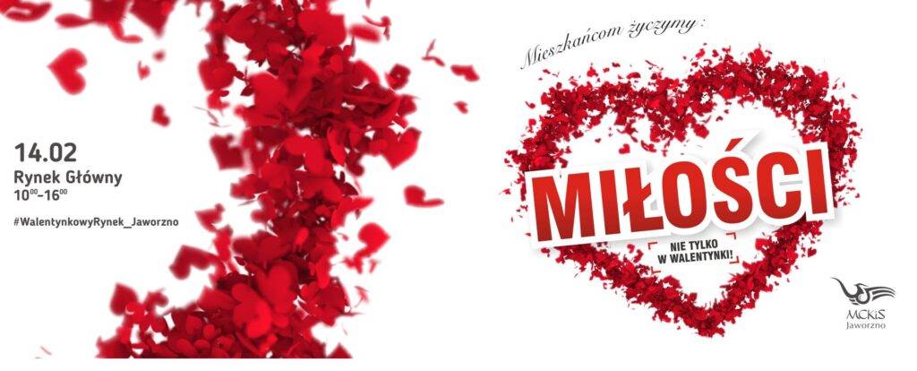 14 lutego do godziny 16 pracownicy MCKiS będą czekać na rynku na zakochane pary. Te mogą zrobić sobie zdjęcie w specjalnej ramce. Po wstawieniu na swój facebookowy profil fotografii i dodaniu tagu #WalentynkowyRynek_Jaworzno, wezmą pary mogą wziąć udział walentynkowej zabawie. Do wygrania są gadżety MCKiS.