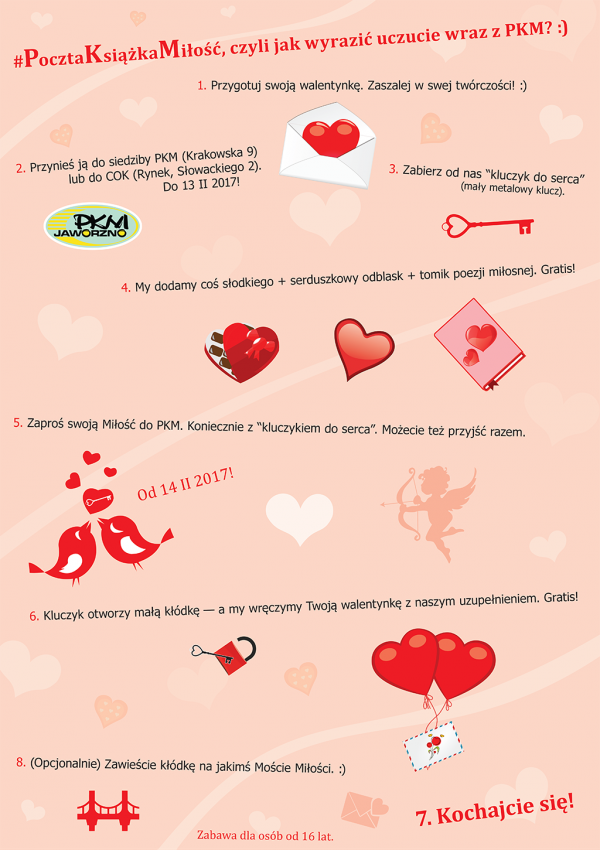 1. Przynieś swoją walentynkę (lub list miłosny) do siedziby PKM (ul. Krakowska 9) lub do Centrum Obsługi Klienta (jaworznicki rynek, ul. Słowackiego 2).