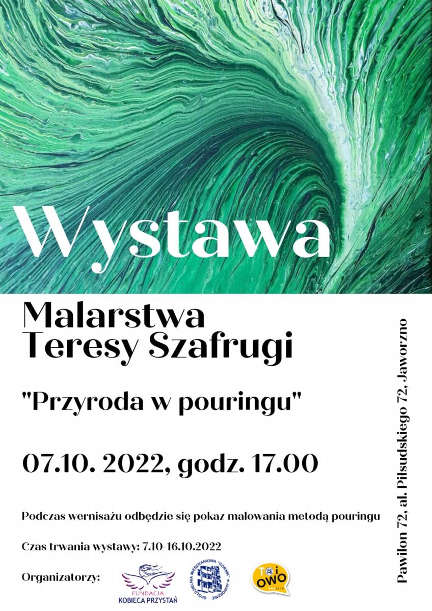 Wernisaż wystawy malarstwa Teresy Szafrugi pt. "Przyroda w pouringu" odbędzie się w najbliższy piątek 7 października o godzinie 17:00 w Klubie To i Owo mieszczącym się w Pawilonie 72 na Osiedlu Podłęże w Jaworznie.