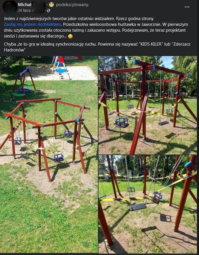 Pan Michał to internauta, który zauważył te niecodzienną sytuację i postanowił nas o niej poinformować. Na swoim profilu w mediach społecznościowych porównuje huśtawkę do Wielkiego Zderzacza Hadronów i proponuje nazwę "KIDS KILER". Zastanawia się także, czy to może przypadkiem nie jest pomysł na grę dla dzieci polegającą na idealnej synchronizacji ruchu.