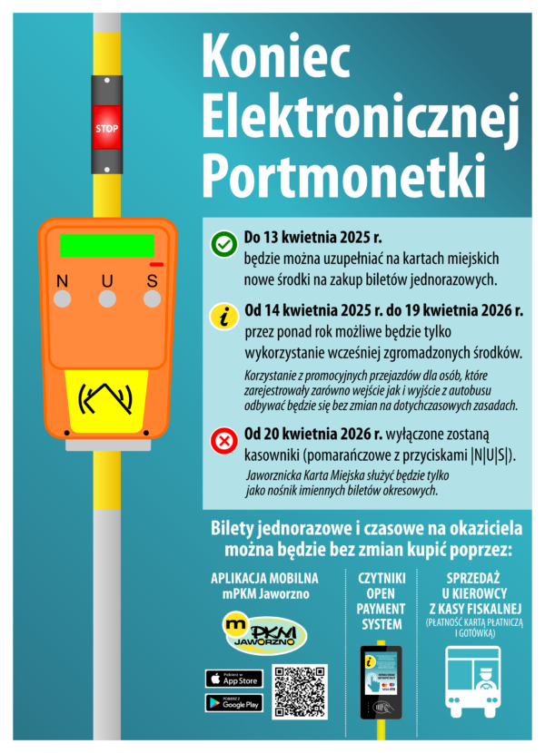 W Jaworznie kończy się etap funkcjonowania Elektronicznej Portmonetki na Karcie Miejskiej. Mieszkańcy, którzy korzystali z tego rozwiązania, powinni zwrócić uwagę na nadchodzące terminy. Zostaną również wyłączone pomarańczowe kasowniki wyposażone w przyciski oznaczone literami N, U i S