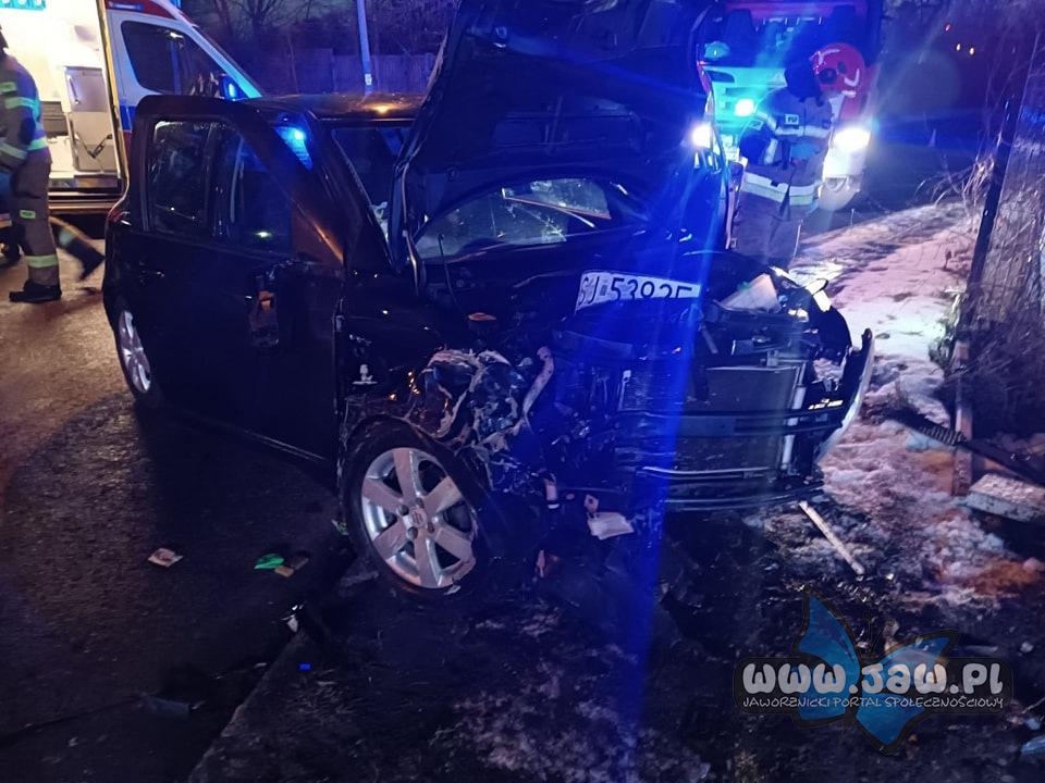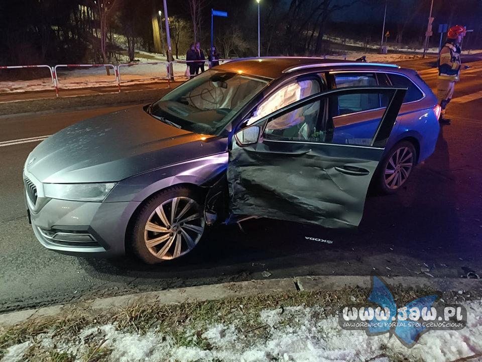 36-letni mieszkaniec Jaworzna, kierując Suzuki na odcinku od ronda w stronę ulicy Domsa, stracił panowanie nad pojazdem. Auto uderzyło bokiem w prawidłowo jadącą Skodę, którą kierował 46-latek. Po zderzeniu z Skodą, auto 36-latka wpadło na słup energetyczny.