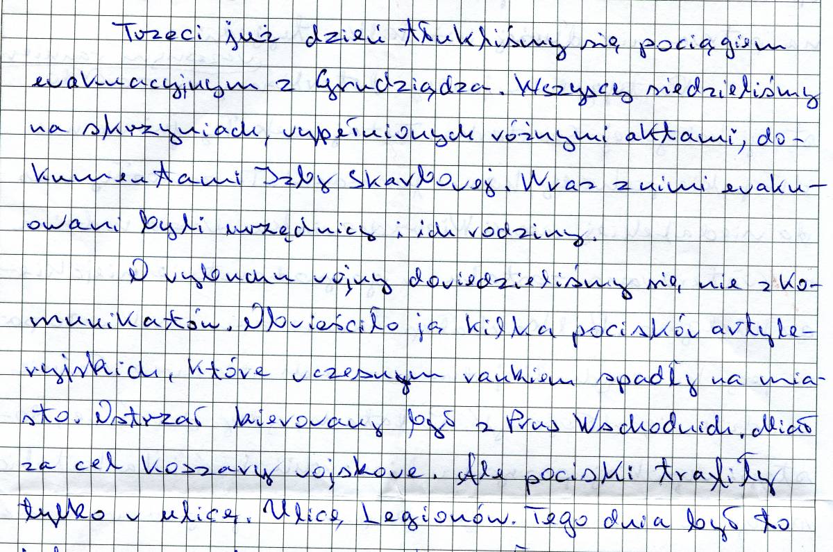 O wybuchu wojny dowiedziałem się nie z komunikatów. Obwieściło ją kilka pocisków artyleryjskich, które wczesnym rankiem spadły na miasto. Ostrzał kierowany był z Prus Wschodnich. Miał za cel koszary wojskowe. Ale pociski trafiły tylko w ulicę. Ulicę Legionów. Tego dnia był to jedyny epizod wojenny. Nasze siły zbrojne wstrzymały agresora tak, że dzień 1 września przebiegł w mieście spokojnie. Zauważyć można było na ulicach niezwykły ruch, spowodowany zapewne koniecznością wzmożonych zakupów artykułów pierwszej potrzeby.