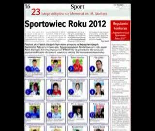 Najpopularniejszego Sportowca Roku 2012 poznamy 23 lutego podczas Memoriału im. Mirosława Stadlera w Hali Widowiskowo-Sportowej w centrum miasta. Więcej informacji na temat Memoriału już wkrótce. Regulamin plebiscytu na Najpopularniejszego Sportowca Roku 2012 znajdą Państwo w gazecie „Co tydzień”. Zapraszamy do udziału w plebiscycie!