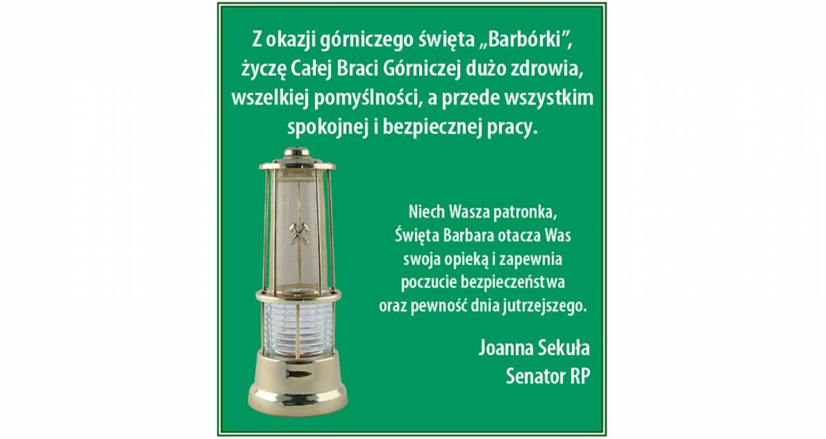 Z okazji górniczego święta "Barbórki" życzenia od Senator RP Joanny Sekuły