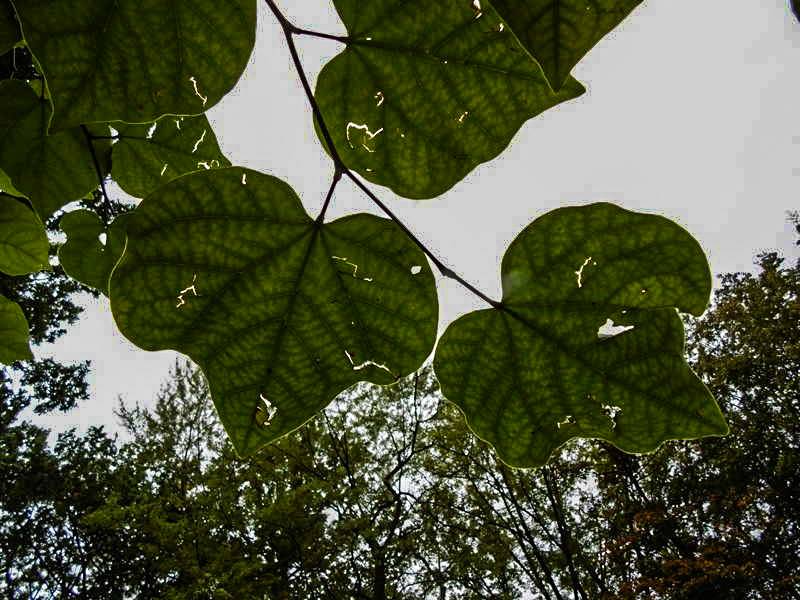 W przypadku tego drzewa są pewne wątpliwości. Ja stawiam na surmię żółtokwiatową - Catalpa ovata. Liście na części gałęzi są wyraźnie trójklapowe.