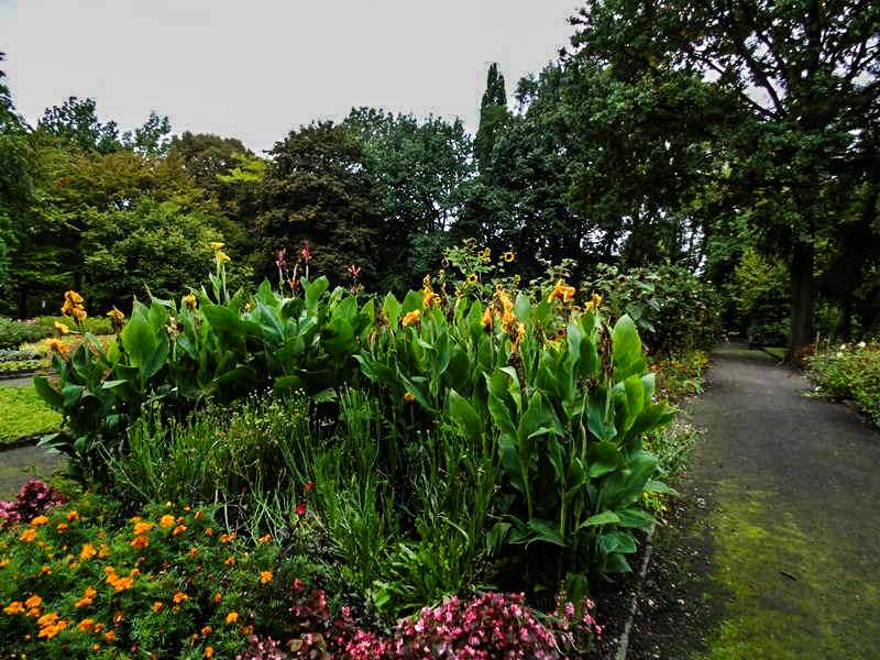W ogrodzie jest wiele klombów. Tutaj rządzi paciorecznik - Canna.
