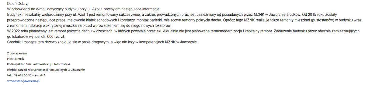 W odpowiedzi na e-mail dotyczący budynku przy ul. Azot 1 przesyłam następujące informacje.