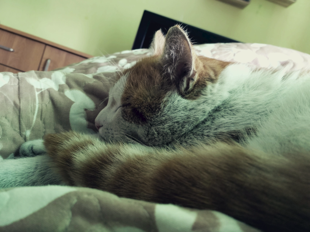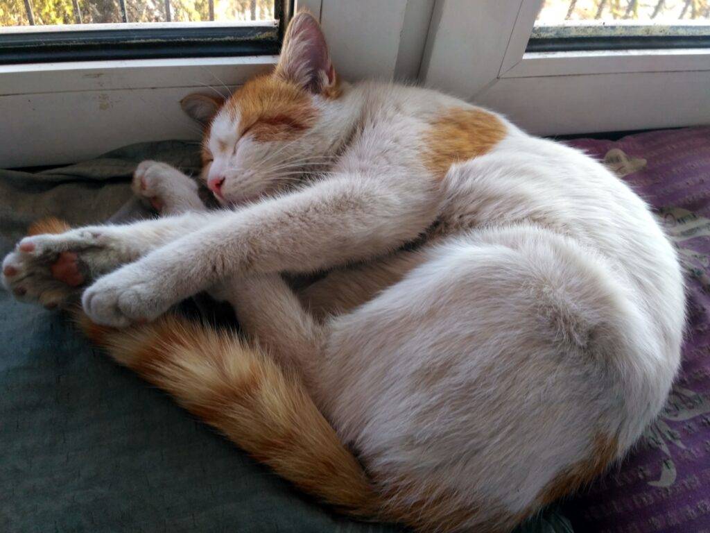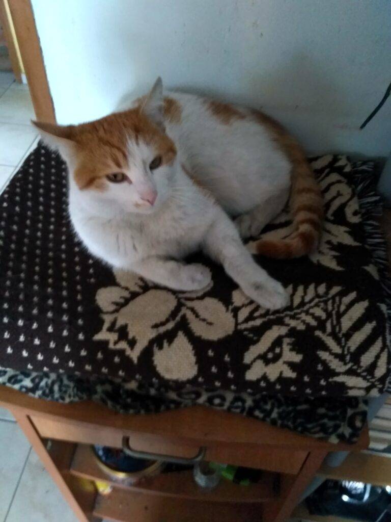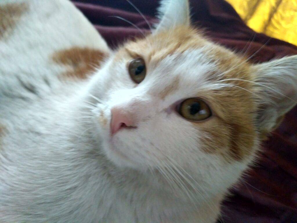 Kot ma biało-rude umaszczenie, plamkę koło lewego oczka i na
