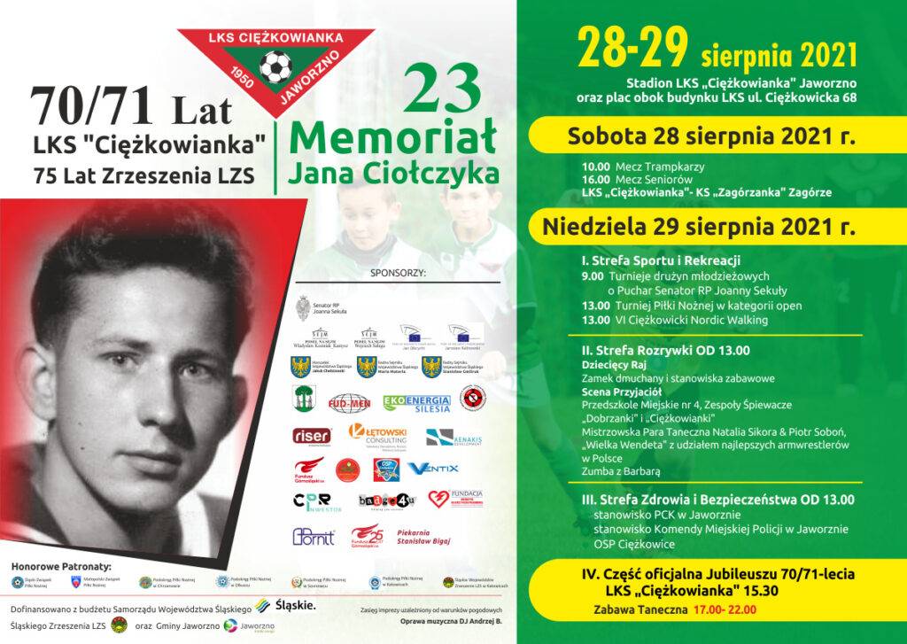 Zarząd LKS "Ciężkowianka" Jaworzno serdecznie zaprasza na 23 Memoriał Jana Ciołczyka zasłużonego działacza społecznego i sportowego, Prezesa LKS "Ciężkowianka" Jaworzno w latach 1982-98 połączony z obchodami Jubileuszu 70/71-lecia Klubu oraz 75-lecia Zrzeszenia LZS.