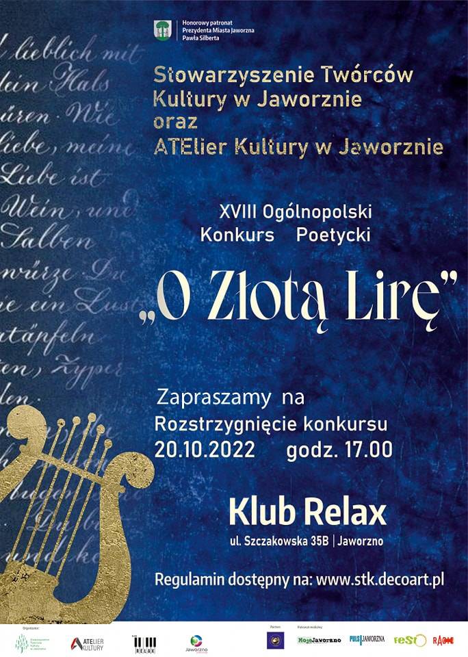 Stowarzyszenie Twórców Kultury w Jaworznie i Atelier Kultury  Klub Relaks zapraszają 20 października o godz. 17 na uroczystość rozstrzygnięcia XVIII edycji Ogólnopolskiego Konkursu Poetyckiego "Złota Lira".