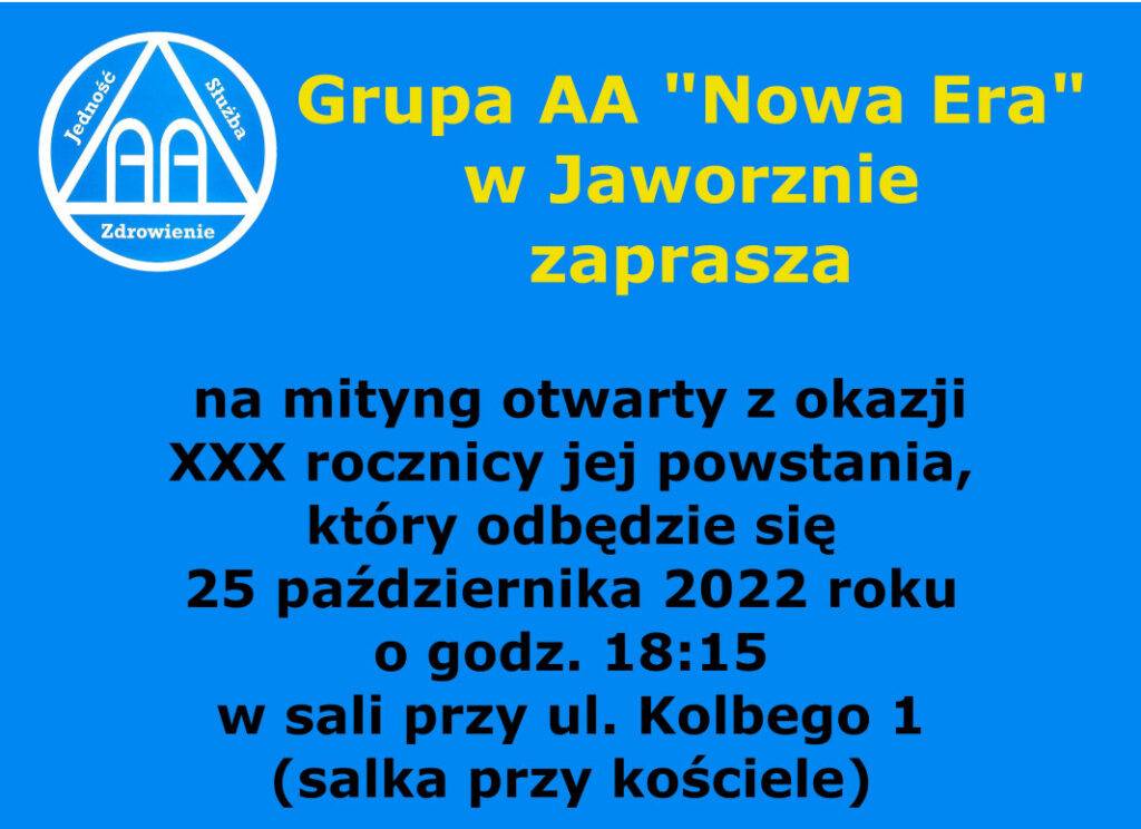 Grupa AA "Nowa Era" zaprasza na mityng otwarty z okazji 30-lecia swego istnienia, który odbędzie się 25.10.2022 (wtorek) o godz. 18:15 przy ul. Kolbego 1 (salka przy kościele). Szczególnie gorąco zapraszamy osoby, które uczestniczyły w spotkaniach grupy w pierwszych latach jej istnienia i późniejszych, a obecnie nie pojawiają się na nich regularnie.