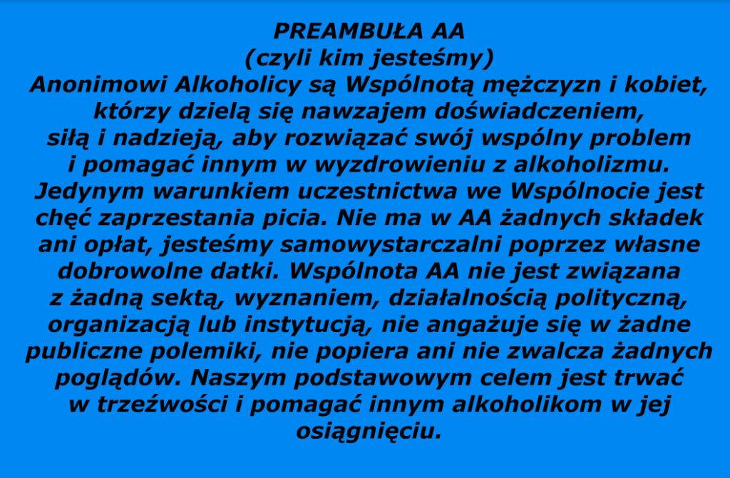 „Anonimowi Alkoholicy są wspólnotą mężczyzn i kobiet, którzy dzielą się nawzajem doświadczeniem, siłą i nadzieją, aby rozwiązać swój wspólny problem i pomagać innym w wyzdrowieniu z alkoholizmu. Jedynym warunkiem uczestnictwa we wspólnocie jest chęć zaprzestania picia. Nie ma w AA żadnych składek ani opłat, jesteśmy samowystarczalni poprzez własne dobrowolne datki. Wspólnota AA nie jest związana z żadną sektą, wyznaniem, działalnością polityczną, organizacją czy instytucją. Nie angażuje się w żadne publiczne polemiki. Nie popiera ani nie zwalcza żadnych poglądów. Naszym podstawowym celem jest trwać w trzeźwości i pomagać innym alkoholikom w jej osiągnięciu”.