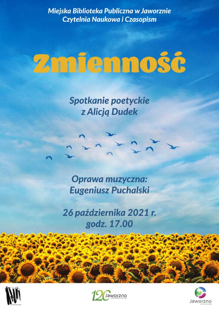Czytelnia Naukowa i Czasopism zaprasza na spotkanie poetyckie Alicji Dudek pt. „Zmienność”, które odbędzie się w Bibliotece Głównej w dniu 26 października 2021 r. o godz. 17.00.