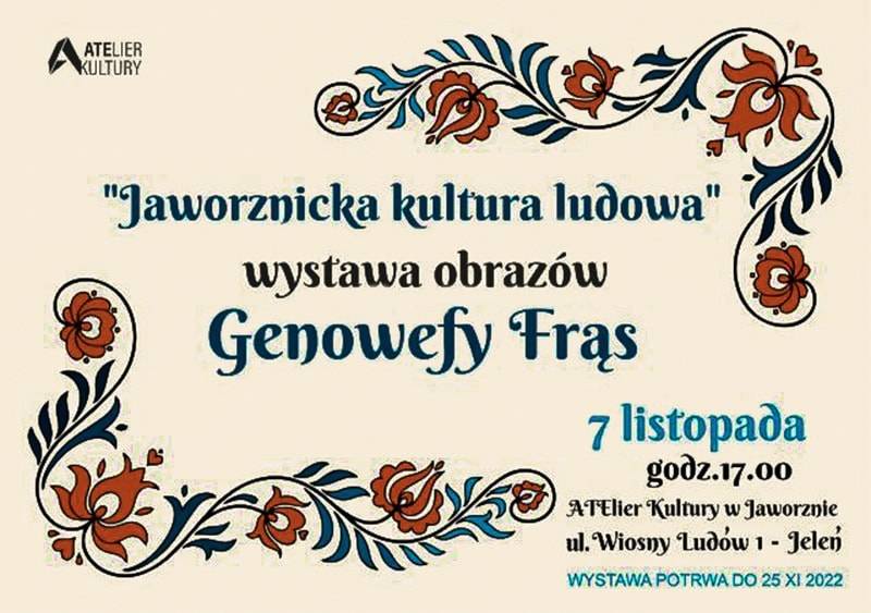 Jaworznianka Genowefa Frąs zaprasza na wystawę malowanych obrazów "Jaworznicka kultura ludowa". Obrazy prezentowane będą w Atelier Kultury, ul. Wiosny Ludów 1 (Jaworzno Jeleń). Wernisaż wystawy odbędzie się 7 listopada o godz. 17.00