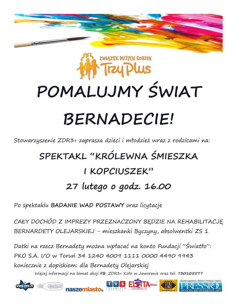 Dochód z akcji będzie w całości przeznaczony na rehabilitację Bernadety Olejarskiej. Zachęcamy do udziału w akcji. Zaprasza Agata Biesiada – rzecznik Związku Dużych Rodzin 3+ w Jaworznie.