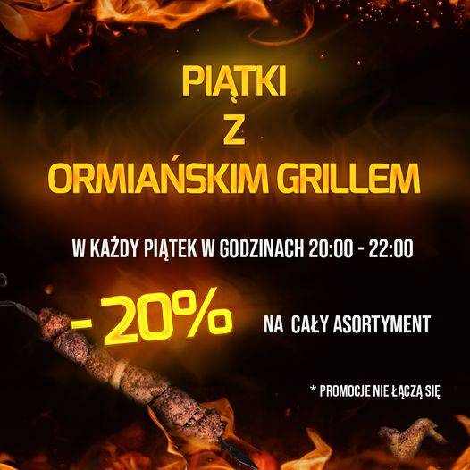 Skorzystaj z promocji i zjedz grillowane dania w cenie niższej o 20%. Wystarczy, że odwiedzisz lokal w piątek w godzinach 20.00.-22.00.