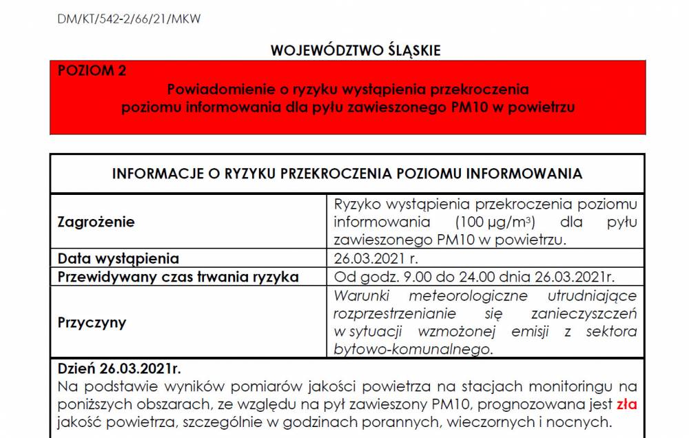 Zła jakość powietrza w Jaworznie 26 marca. Jak informuje Powiatowe Centrum Zarządzania Kryzysowego, w woj. śląskim, wliczając Jaworzno, istnieje ryzyko przekroczenia poziomu alarmowego pyłu zawieszonego P10. Z tego powodu został ogłoszony alarm drugiego stopnia.