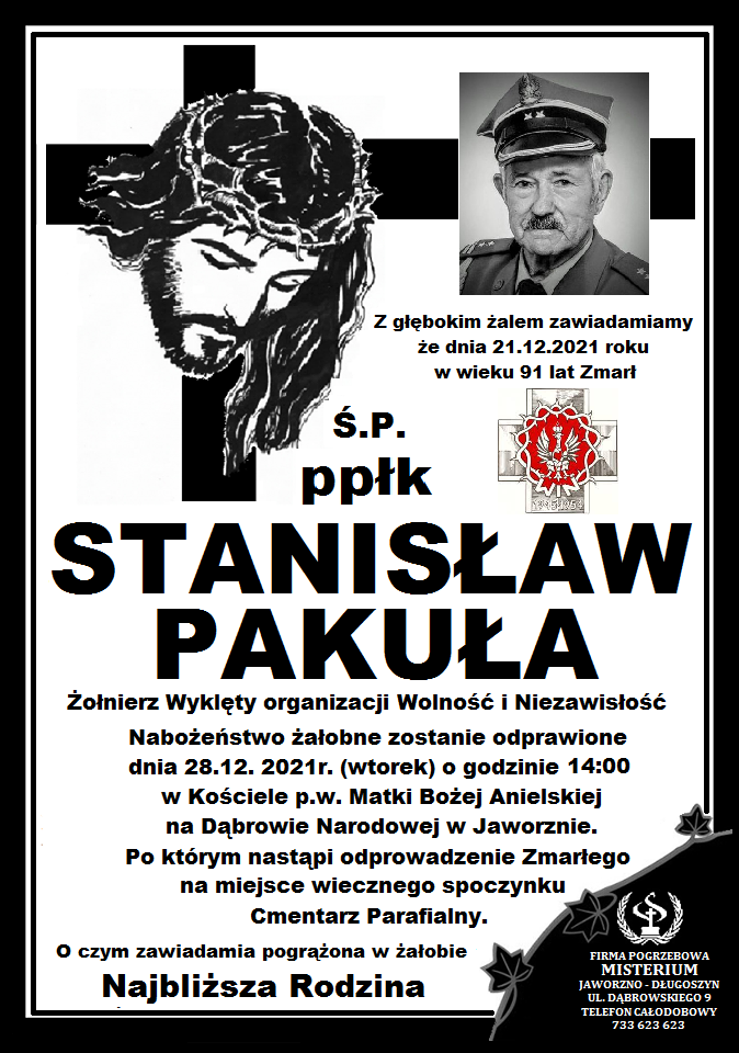21 grudnia 2021 roku, w wieku 91 lat zmarł podpułkownik Stanisław Pakuła ps. „Krzewina”. Żołnierz należący do organizacji „Wolność i Niezawisłość”.