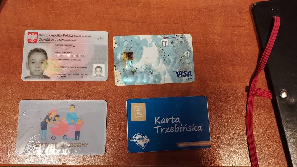 W środku znajdował się Dowód osobisty, karta płatnicza, Karta Dużej Rodziny oraz Karta Trzebińska.