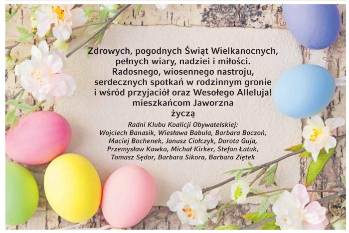 Zdrowych, pogodnych Świąt Wielkanocnych, pełnych wiary, nadziei i miłości. Radosnego, wiosennego nastroju, serdecznych spotkań w rodzinnym gronie i wśród przyjaciół oraz Wesołego Alleluja! mieszkańcom Jaworzna życzą