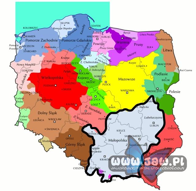 Regiony historyczne w Polsce z zaznaczoną Małopolską (wikipedia)
