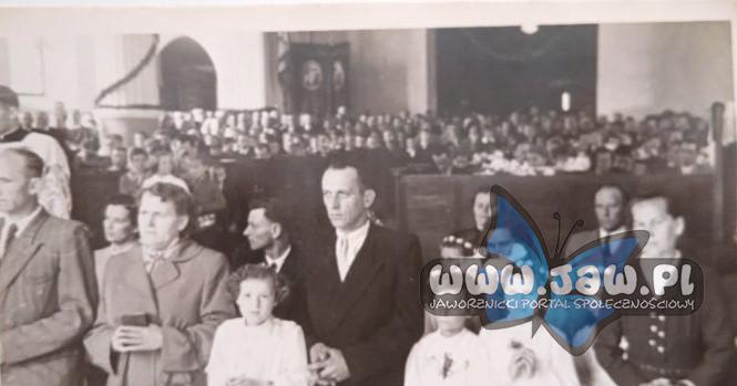 Wnętrze jaworznickiego kościoła św. Wojciecha usytuowanego tymczasowo w części wybudowanej przed wojną. Wierni zwróceni w stronę (bocznego dziś) ołtarza św. Józefa (zbiory prywatne)