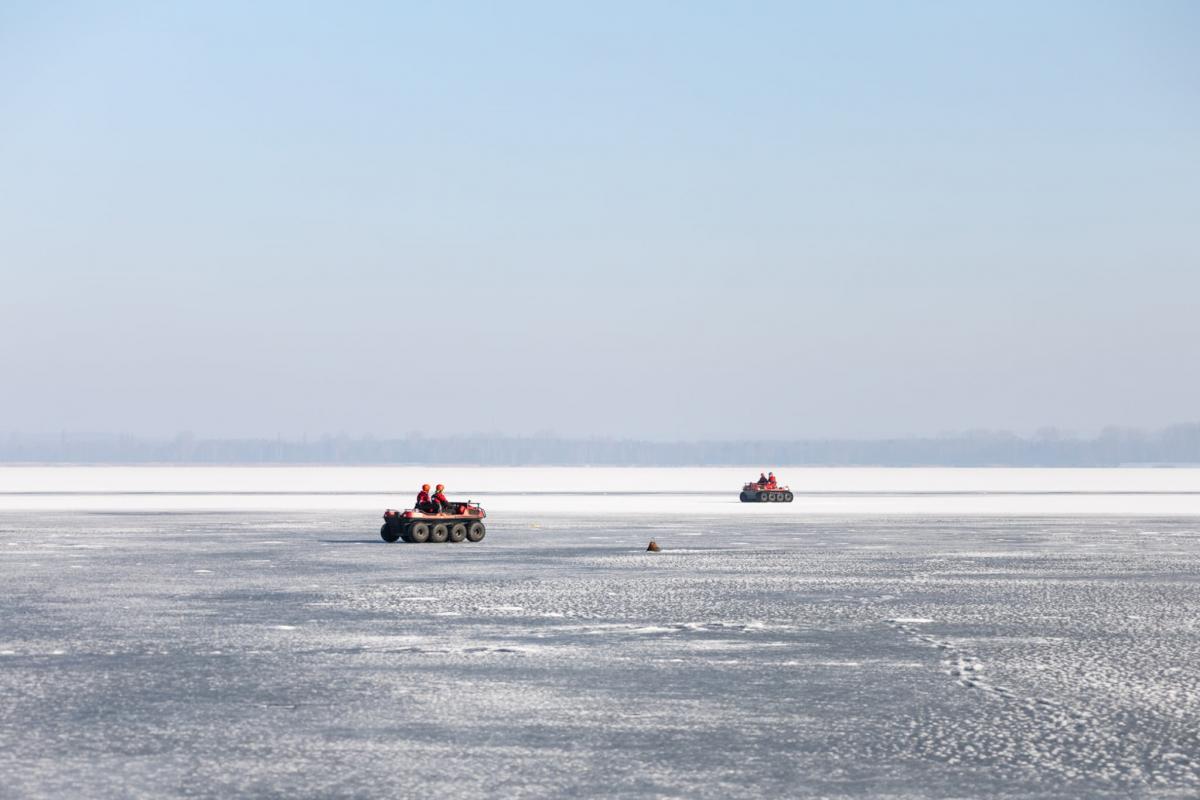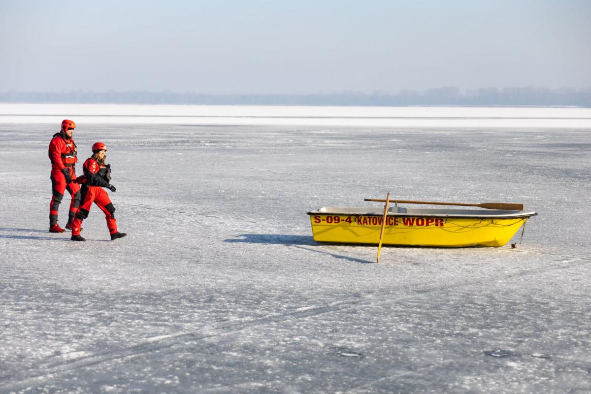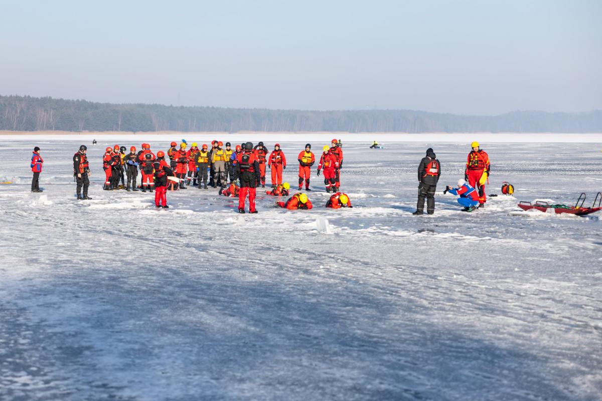 Kosmos skutej lodem wody. Niezwykłe zdjęcia z Dziećkowic. Ćwiczenia WOPR na zalewie Dziećkowice