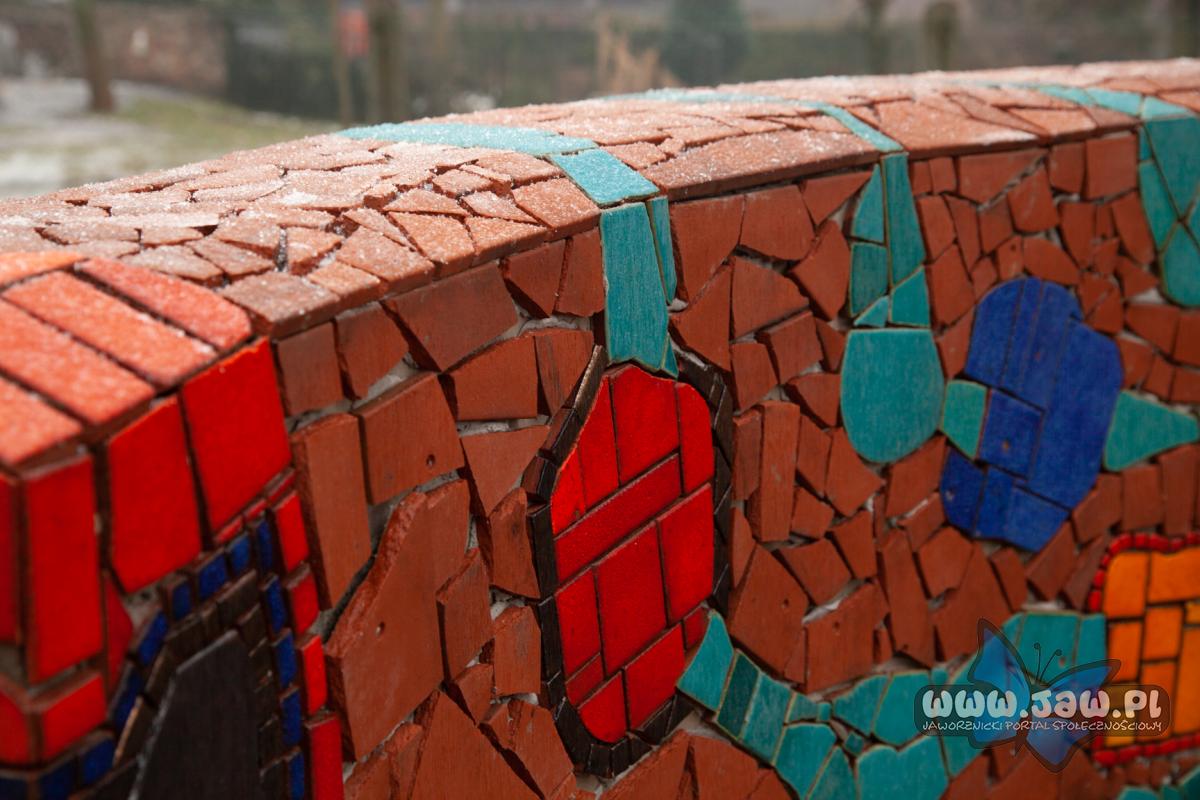 Fragment jednej z ławek ze skweru obok domu wspólnoty. Wyłożona szkliwionymi fragmentami dachówek. Mozaiki są inspirowane twórczością Hundertwassera. Pracowali przy nich mężczyźni ze wspólnoty Betlejem.