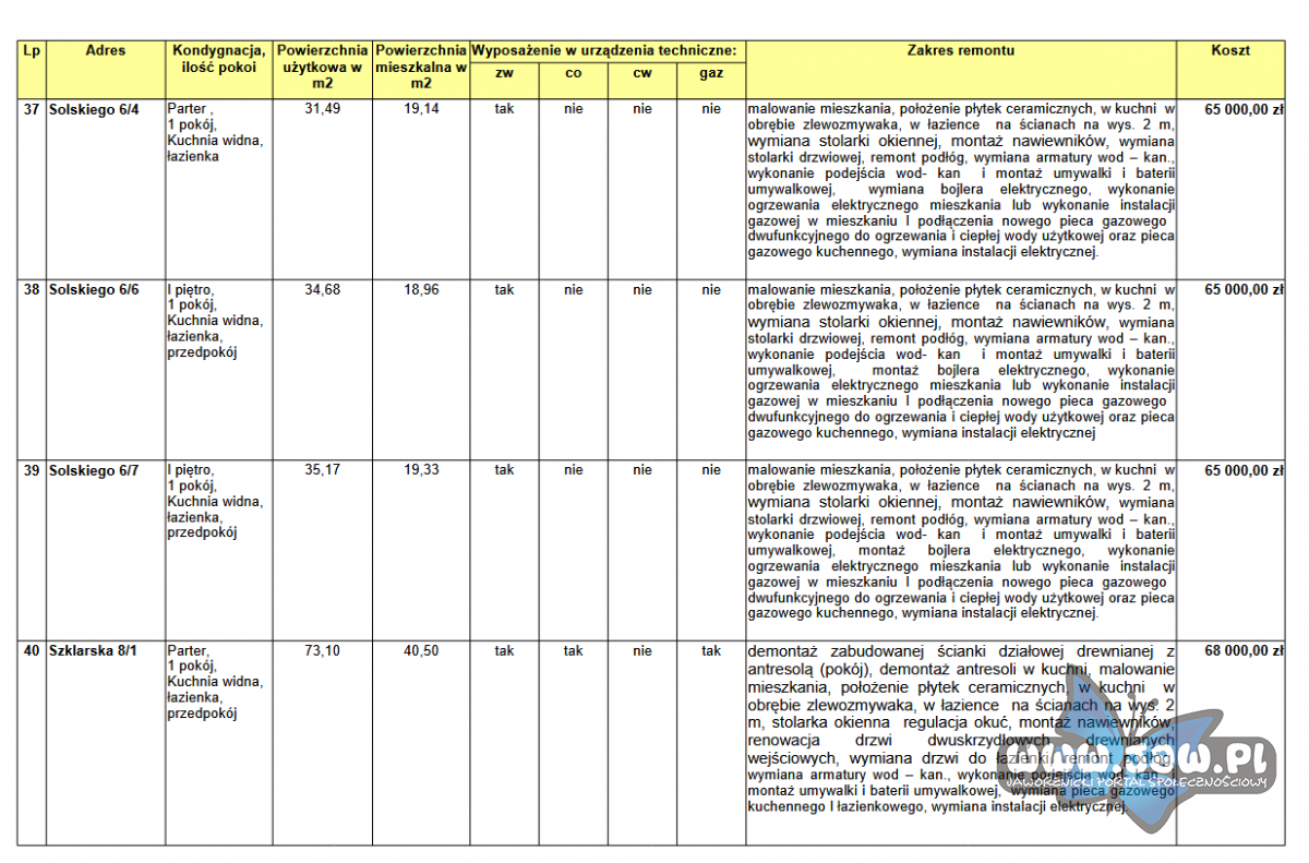 Lista mieszkań i harmonogram (źródło: MZNK Jaworzno)