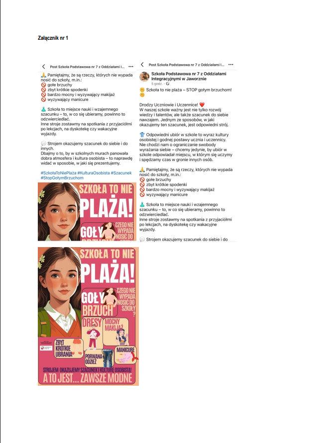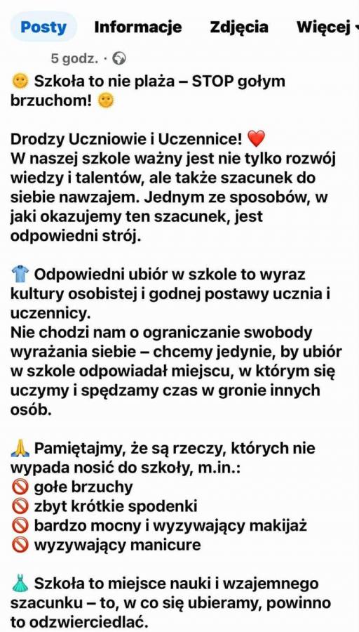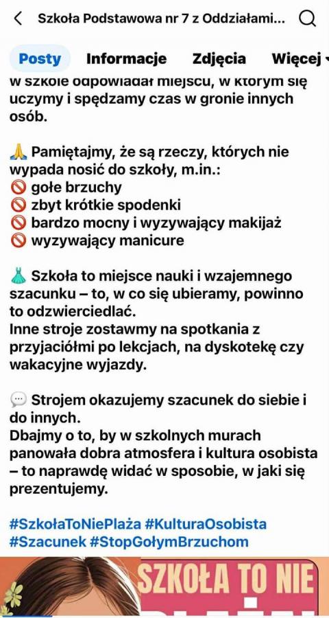 Konfederacja Kobiet RP podjęła działania mające na celu promowanie kultury osobistej i godnego ubioru uczniów, w ramach kampanii Szkoła to nie plaża. Fundacja zwróciła uwagę na elementy garderoby uznane za nieodpowiednie w szkolnych murach, takie jak zbyt mocny makijaż czy krótkie ubrania. Hasło to wywołało kontrowersje i zostało skrytykowane przez rodziców i uczniów, którzy uważają, że każdy powinien mieć prawo do swobody wyrażania siebie. Sytuacja podniosła kwestię granic ingerencji w indywidualne prawa uczniów. Działania podjęte przez szkoły w tym temacie spotkały się z rozbieżnymi reakcjami społecznymi.