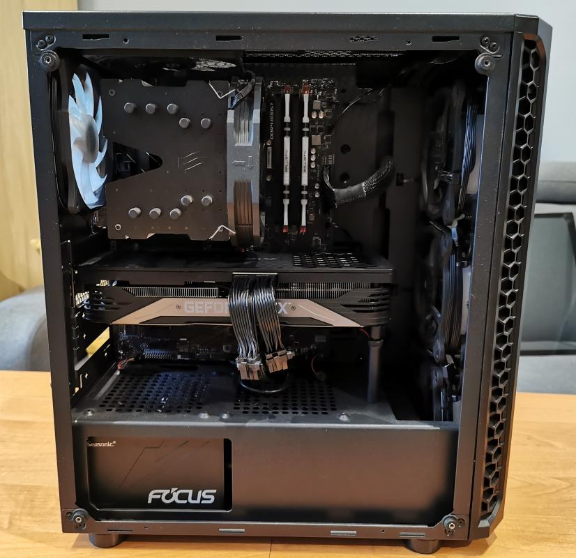 Komputer całkiem przyzwoicie radzi sobie z wymagającymi tytułami. Ostatnie w co grałem to Cyberpunk 2077. Na monitorze 21:9 3440x1440 na zoptymalizowanych ustawieniach (mix średnich i wysokich) przez 99% czasu osiąga od 60 do 130 fps zależnie od miejsca w jakim się znajdujemy. Są w grze bardziej wymagające miejsca gdzie czasami klatki spadną do około 50 fps. Cyberpunk to pomimo stażu rynkowego w dalszym ciągu bardzo wymagająca gra.